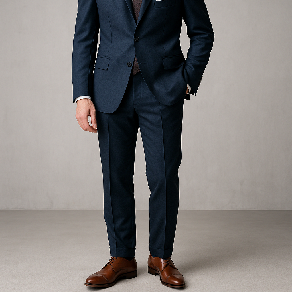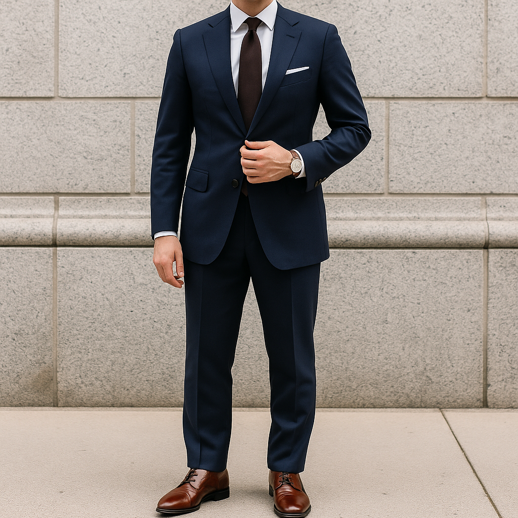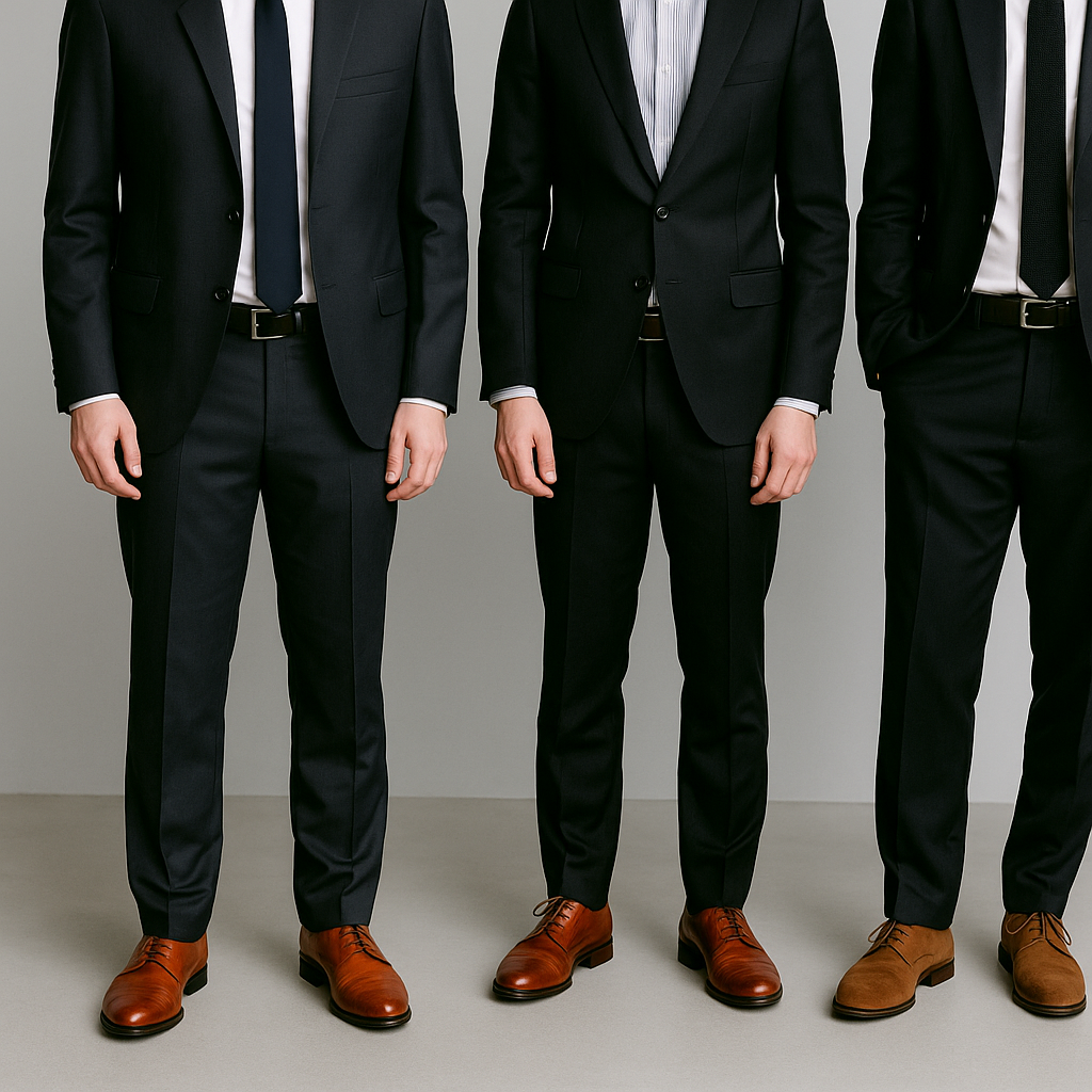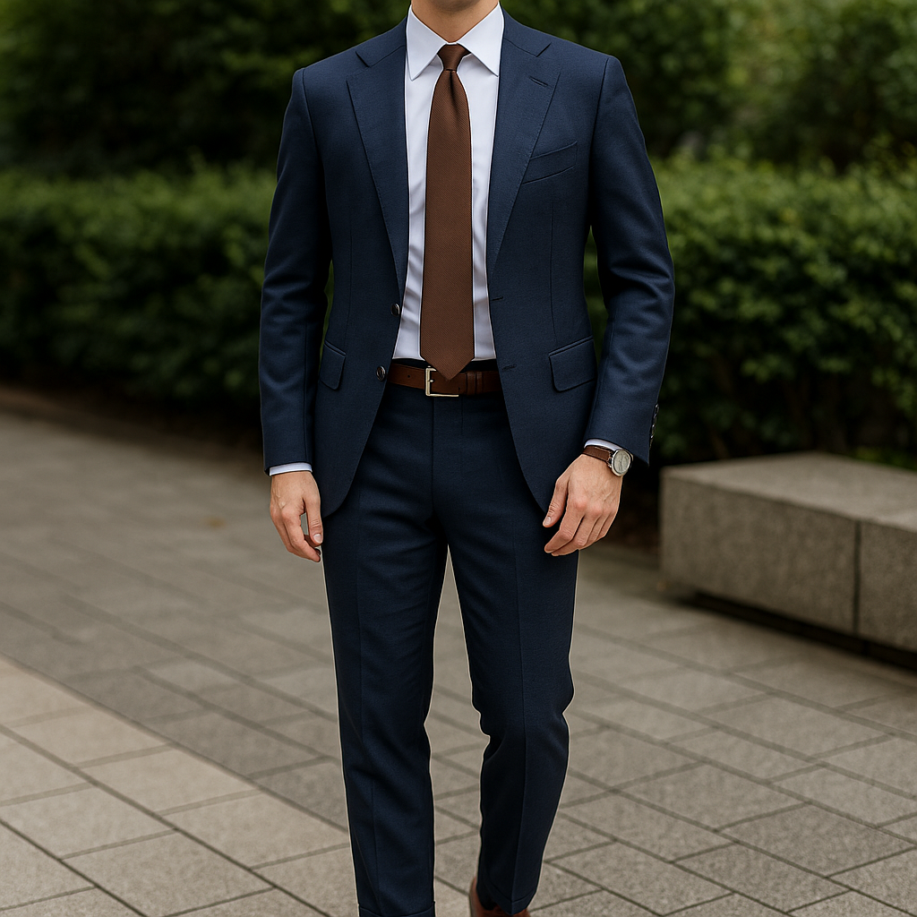 スーツの色と茶靴のバランスは、印象を決める重要なポイントです。