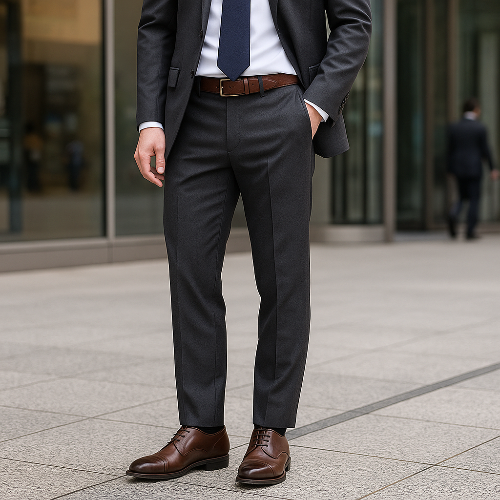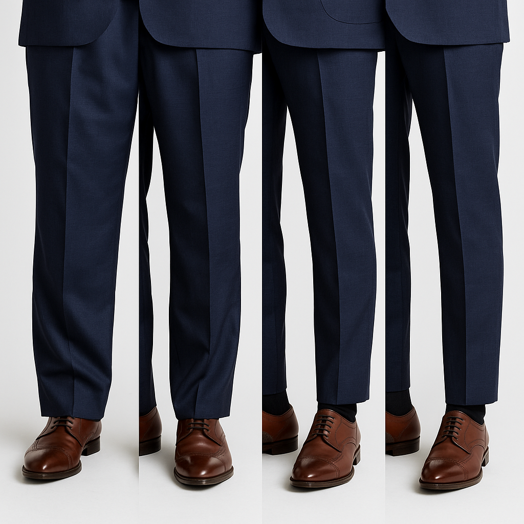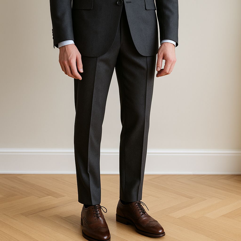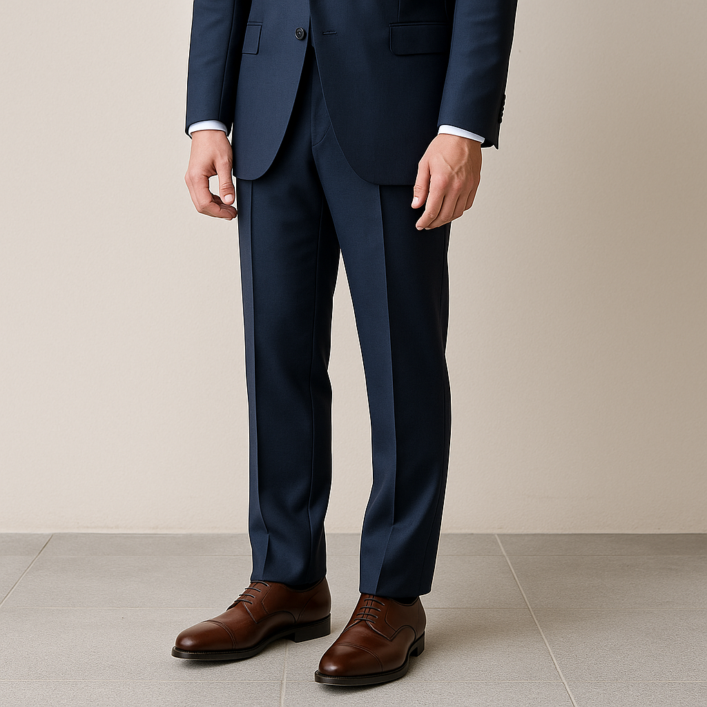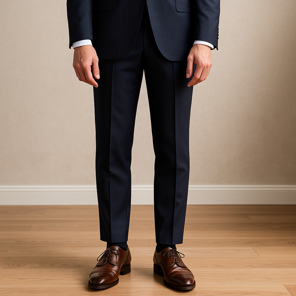 裾がたるまず、まっすぐ落ちるようなシルエットが特徴です。以前は“丈が短い=だらしない”と見られがちでしたが、現代のスーツトレンドでは「清潔感」や「軽快さ」を演出できる丈として人気を集めています。