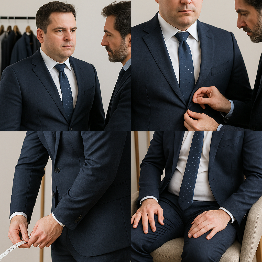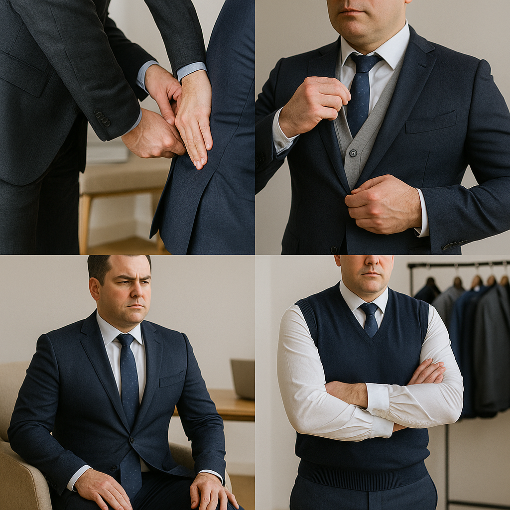 - ジャケットのボタンが自然に閉まるか(立ったとき・座ったとき両方確認)
