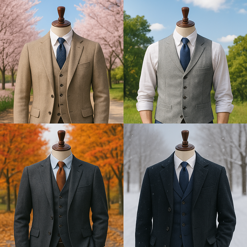 スーツベストは、季節ごとに素材や組み合わせを変えることで、一年を通して活躍します。