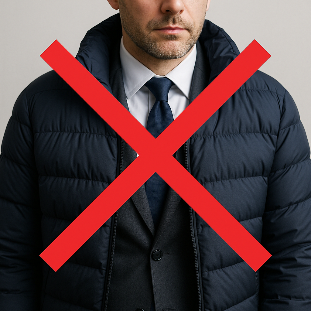 スーツ姿にダウンを羽織ると、一見暖かく実用的に見えるものの、“冬のラフスタイル”という印象を与えやすく、相手によっては「軽装」「だらしない」と感じることもあります。