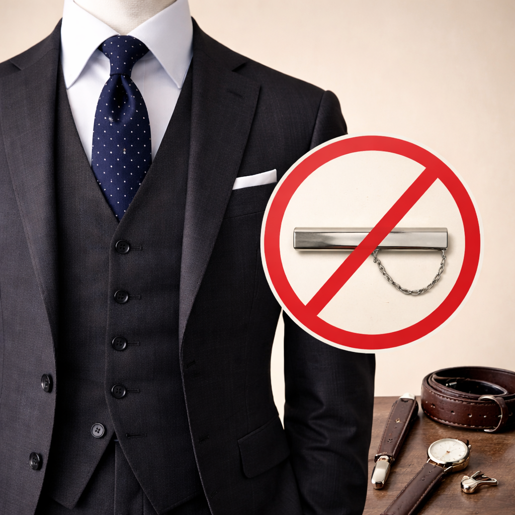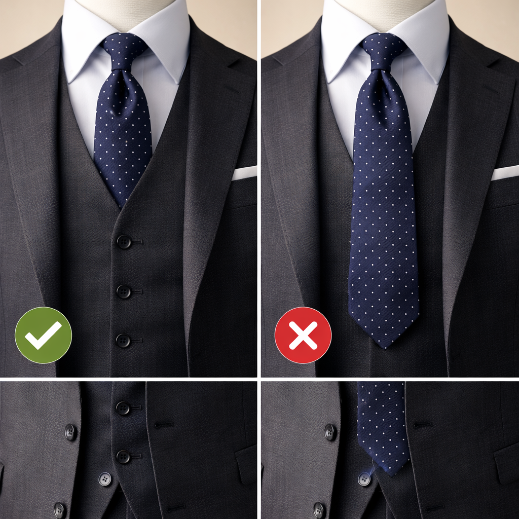特に正統派のスリーピーススーツでは、ネクタイがベストから覗いている状態は、仕立てや着こなしが未完成、あるいはサイズが合っていないように見えやすく、細部に気を配れていない印象を与えてしまいます。