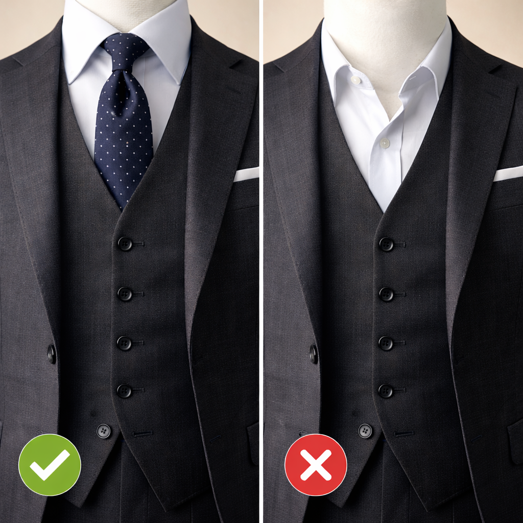 ベストの前開き(Vゾーン)は、ネクタイを最も美しく、かつ立体的に見せるための「額縁」の役割を果たします。