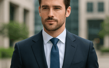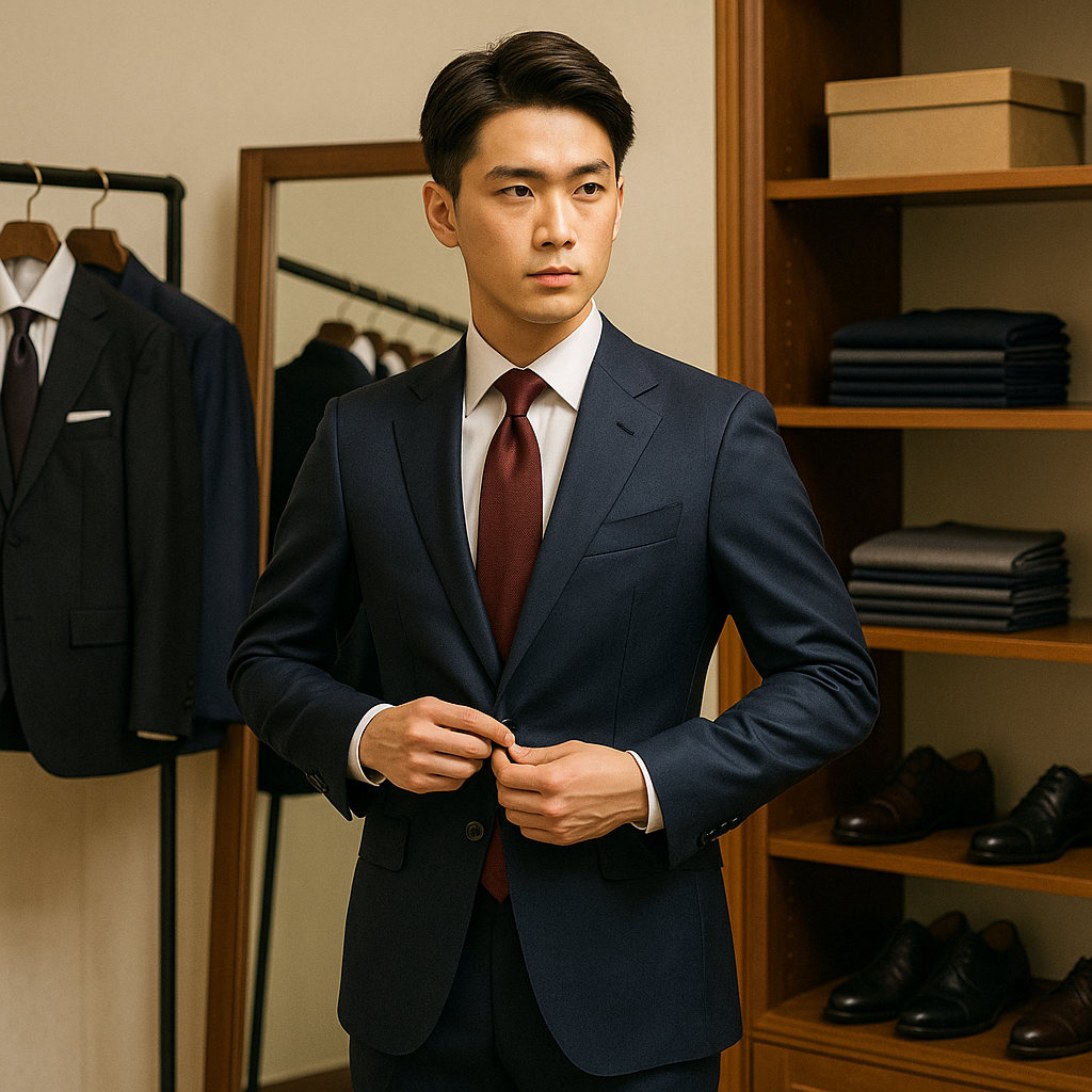 - 落ち着いた雰囲気 → ネイビー無地、細身シルエット、シンプルな無地ネクタイ